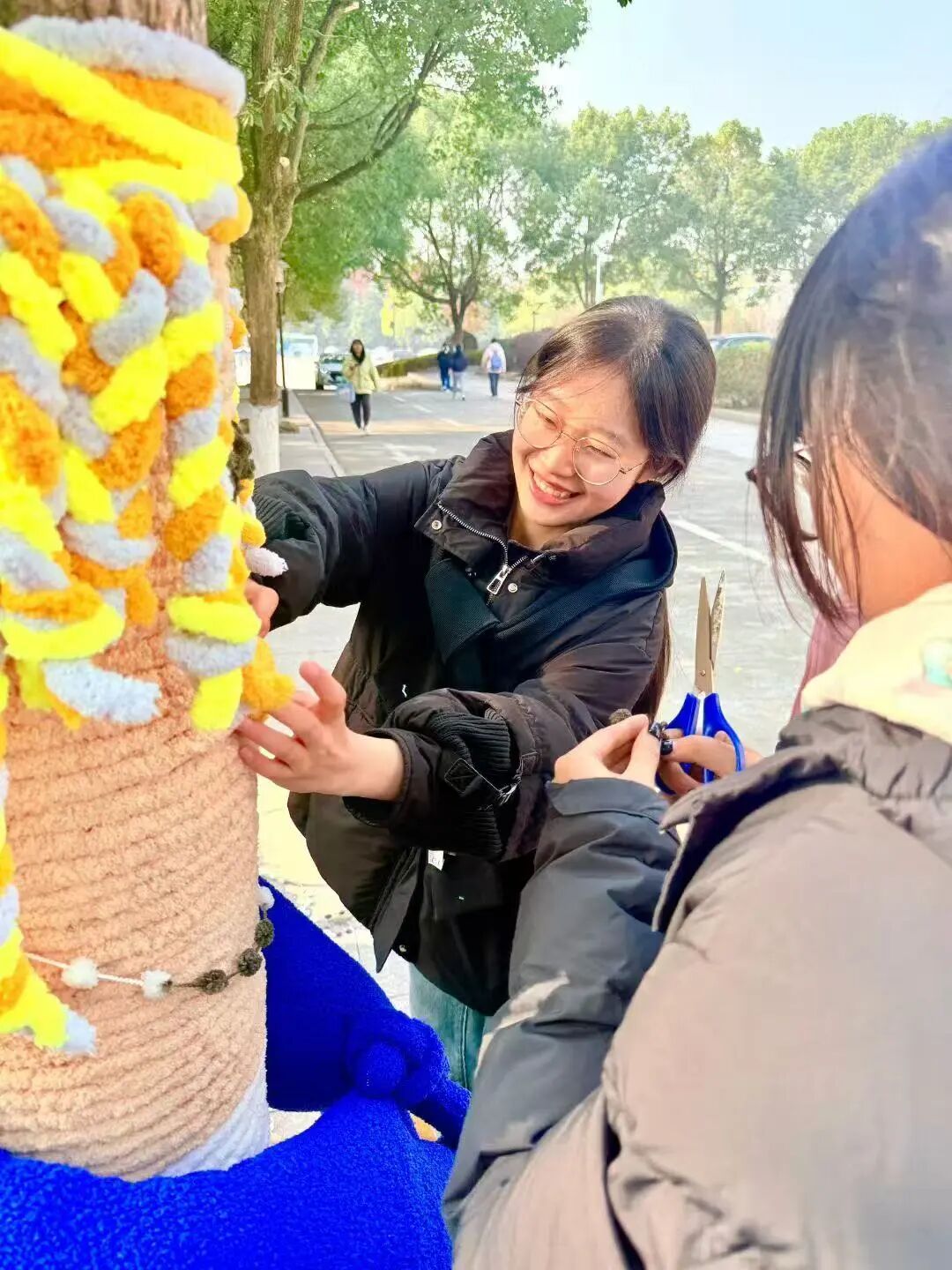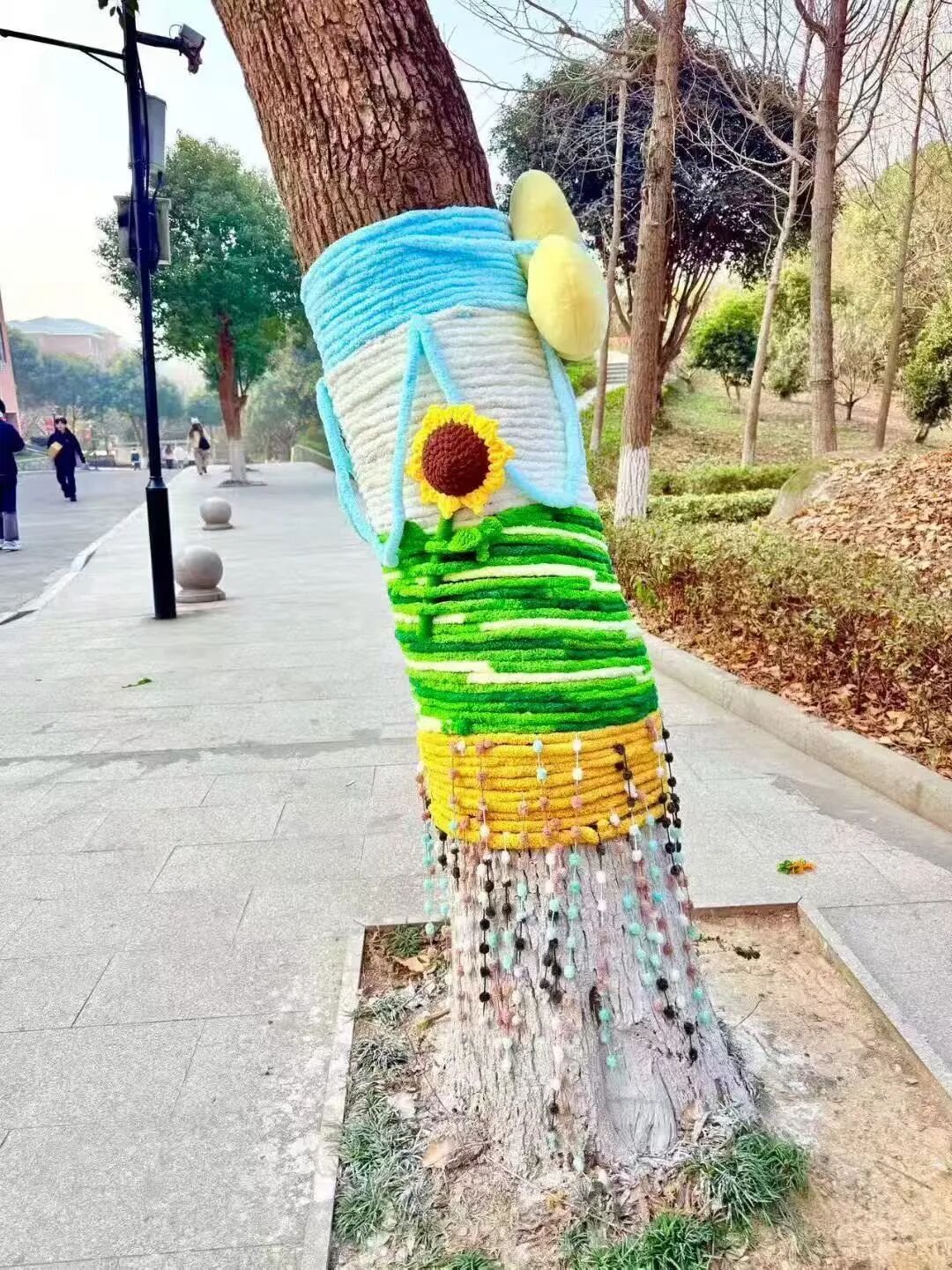 活动现场,同学们热情洋溢,分工有序。她们精心选取黄、蓝、绿等多彩毛线,以巧手匠心环绕树干进行编织,赋予树木生动可爱的“发型”与拟人化形象。此外,同学们还巧妙点缀以象征阳光的向日葵、灵动飘逸的彩色流苏等装饰,使原本朴实无华的树干,化身为一件件充满童趣与美感的公共艺术作品,引得过路师生频频驻足欣赏。