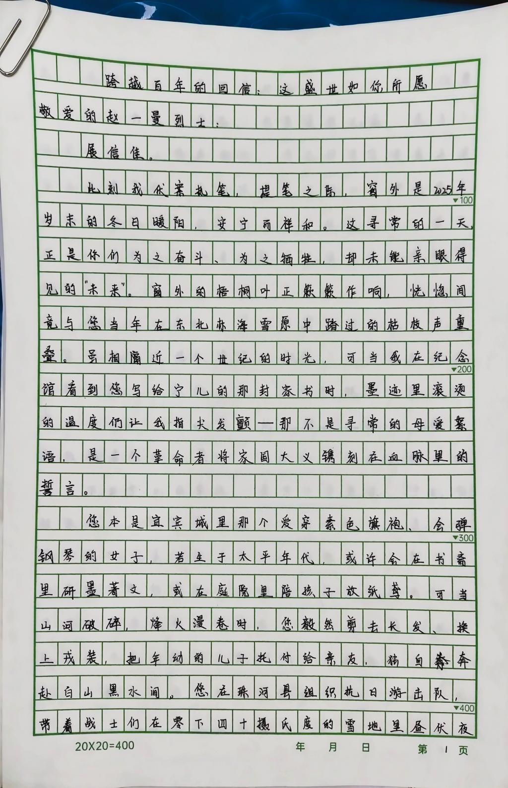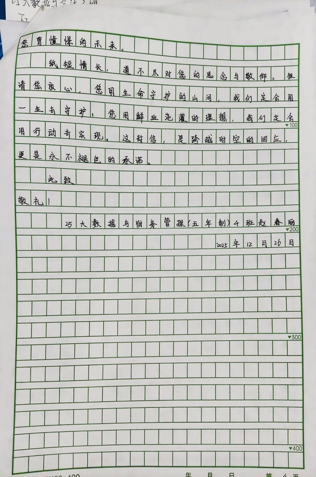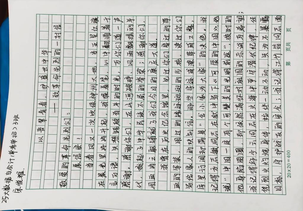 活动中,我院学子以笔为媒,以信寄情,将对先烈的追思敬仰与青年学子的赤忱初心相融,用文字回溯峥嵘岁月里的英雄篇章,用笔触诠释新时代财会人的使命与初心。今日,我们精选优秀书信作品予以展示,一同聆听青年之声,感悟红色精神的时代传承。