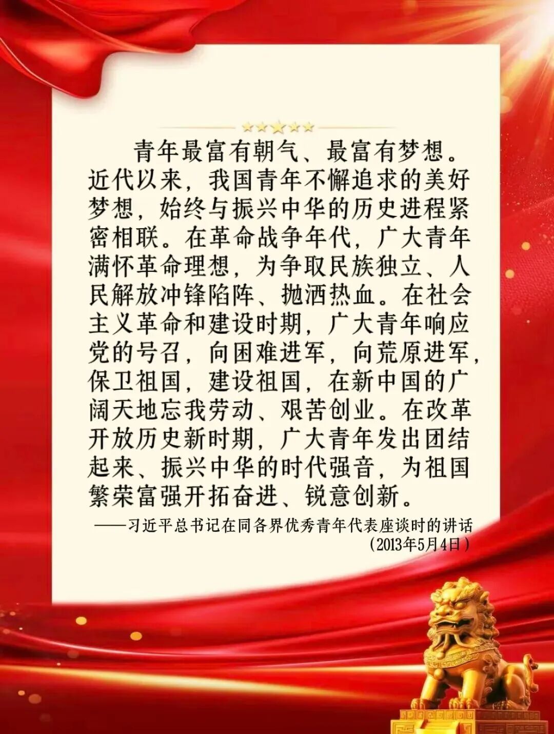 感悟:她读到习近平总书记对青年的寄语,深切体悟到:从民族危亡时的冲锋陷阵,到新中国初期的艰苦创业,再到改革开放后的敢为人先,一代代青年把个人梦想熔铸进国家史诗。今日和平盛世,科技、乡村、创业、文化皆待破壁,她愿以持续学习为桨,以家国情怀为帆,把挫折当阶梯,把创新当习惯,让青春在解决真问题、创造真价值中发光,与亿万同辈一起,汇成推动民族复兴的澎湃后浪。