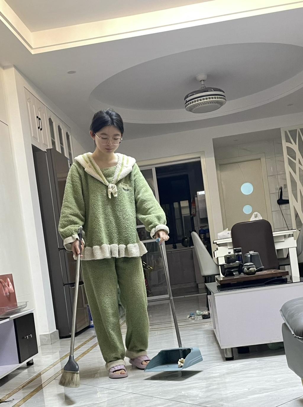 早上她便起床走进厨房为父母准备早餐。她热好牛奶,煎了荷包蛋,还搭配了父母爱吃的面包。饭后,她主动收拾碗筷、清洗餐具,又拿起拖把将客厅和卧室拖得一尘不染。晚上,她和父母围在餐桌前一起包饺子,暖暖的氛围让她感到无比幸福。