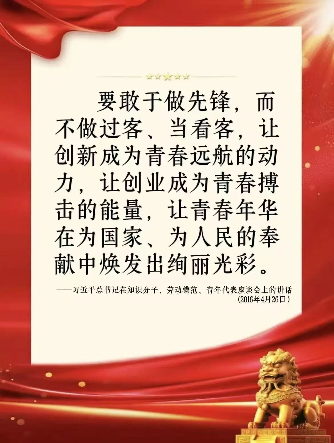 领读人感悟:这段讲话将青年与国家未来紧紧相连,指明青年的精神与素养是国家发展的底气。在中国梦的时代蓝图里,青年当以信念锚定方向,以担当践行使命,于勤学苦练中积蓄力量,在奋斗里让青春与时代共振 —— 这是对青年的召唤,亦是青春最美的注脚。