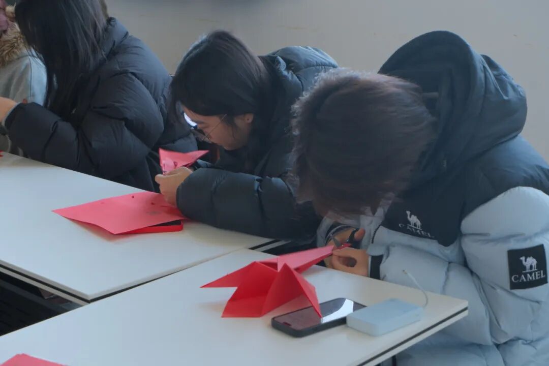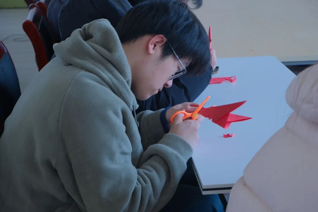 活动现场氛围温馨热烈,老师们先从折叠、描线到裁剪、镂空,同学们认真聆听、耐心实践,在一折一剪、一刀一刻中专注创作,福字、窗花、团圆纹样等作品栩栩如生,指尖流转的不仅是剪纸技艺,更是青春朝气与文化温情。