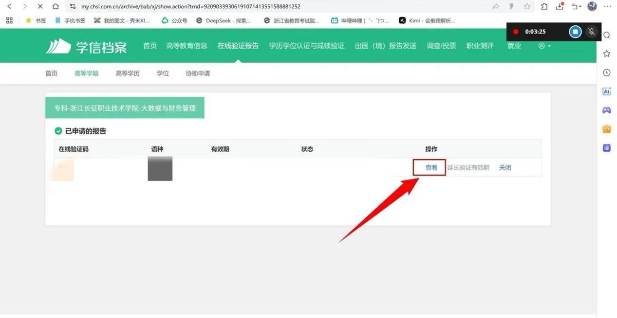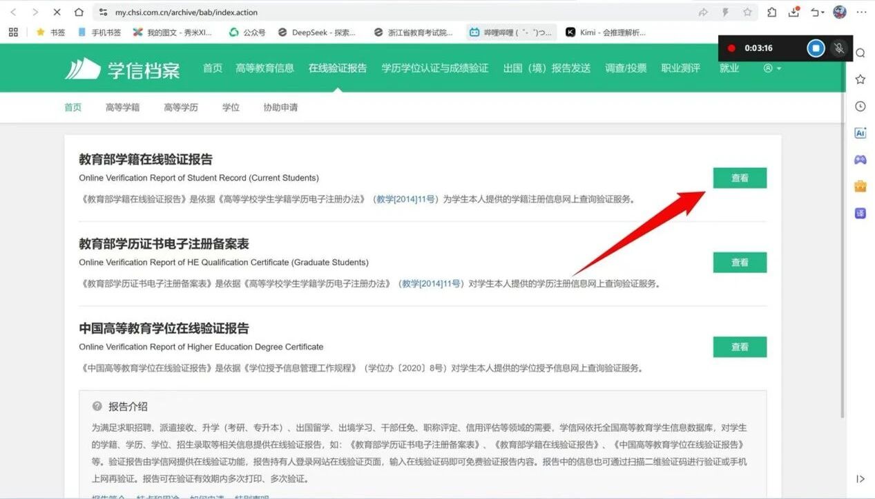 教育部学籍在线验证报告栏目处点击查看