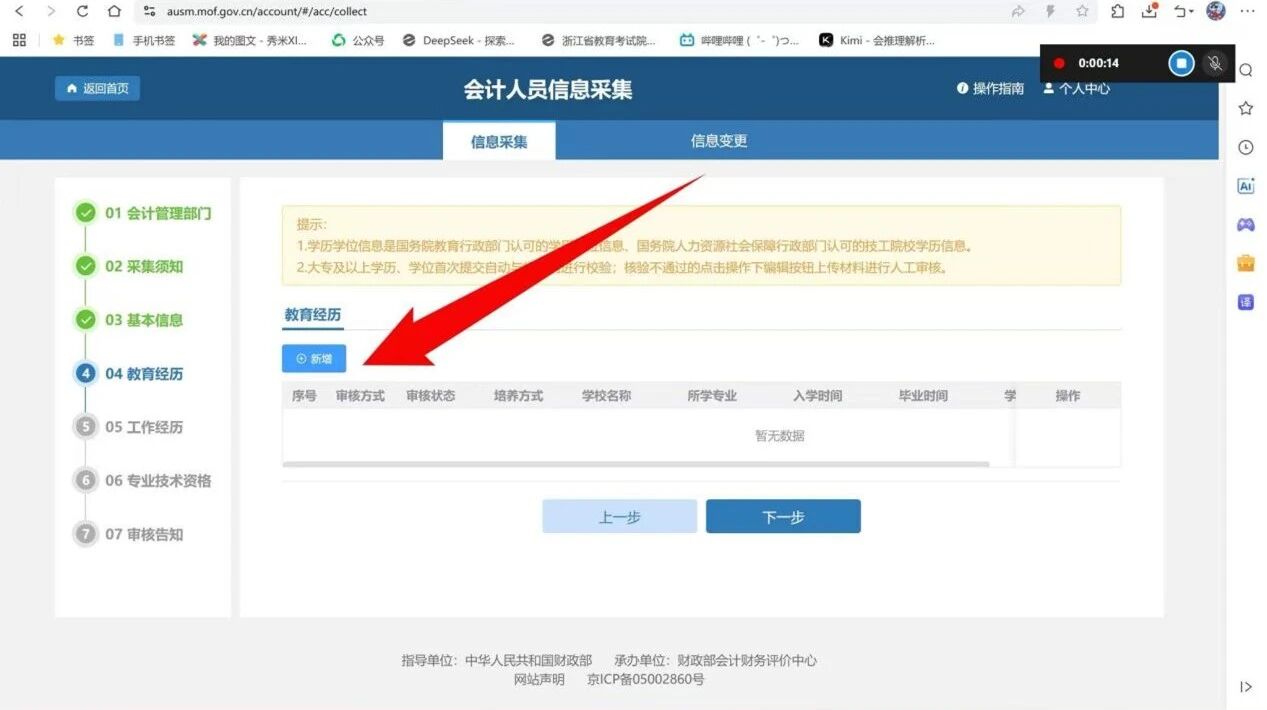 上交截图后点击下一步进入工作经历和专业技术资格采集(无工作经历和无相关技能证书可直接下一步)
