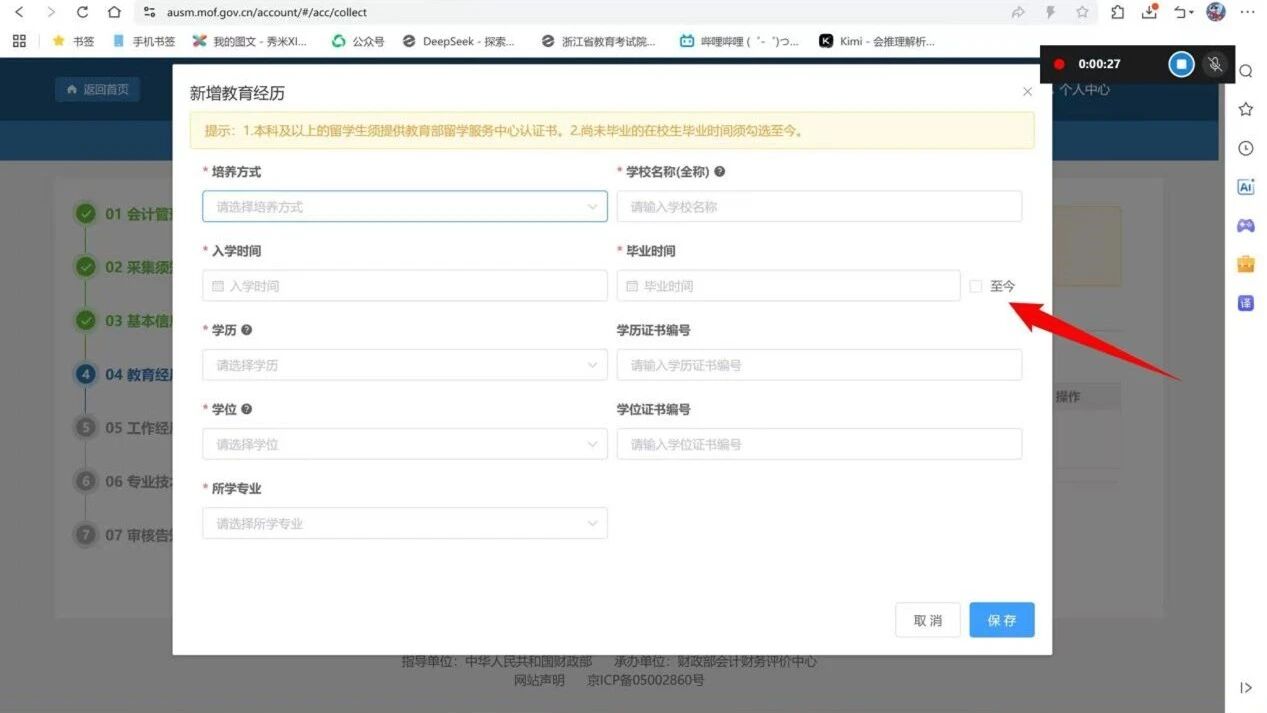 填写教育经历,点击新增,在校学生毕业时间选择至今,附件上传需要学信网证明才可审核通过