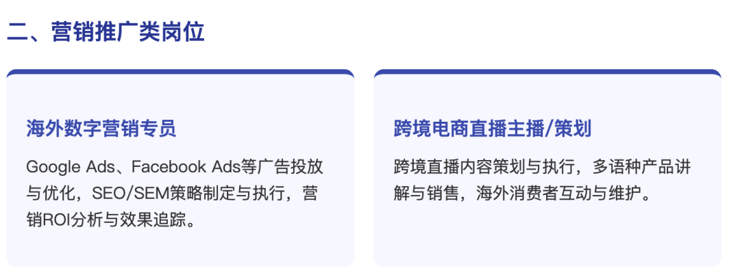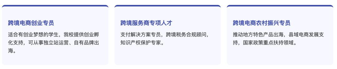 培养掌握跨境电商前沿知识与数智化运营技能,具备多平台AI化运营、数据驱动的营销推广、智能客服与直播、跨境物流优化等综合能力,能从事跨境电商智能运营、AI直播策划及商业数据分析、视觉设计、网络客服、跨境物流等工作,拥有国际化视野、创新性思维和数字化素养的高技能人才。
