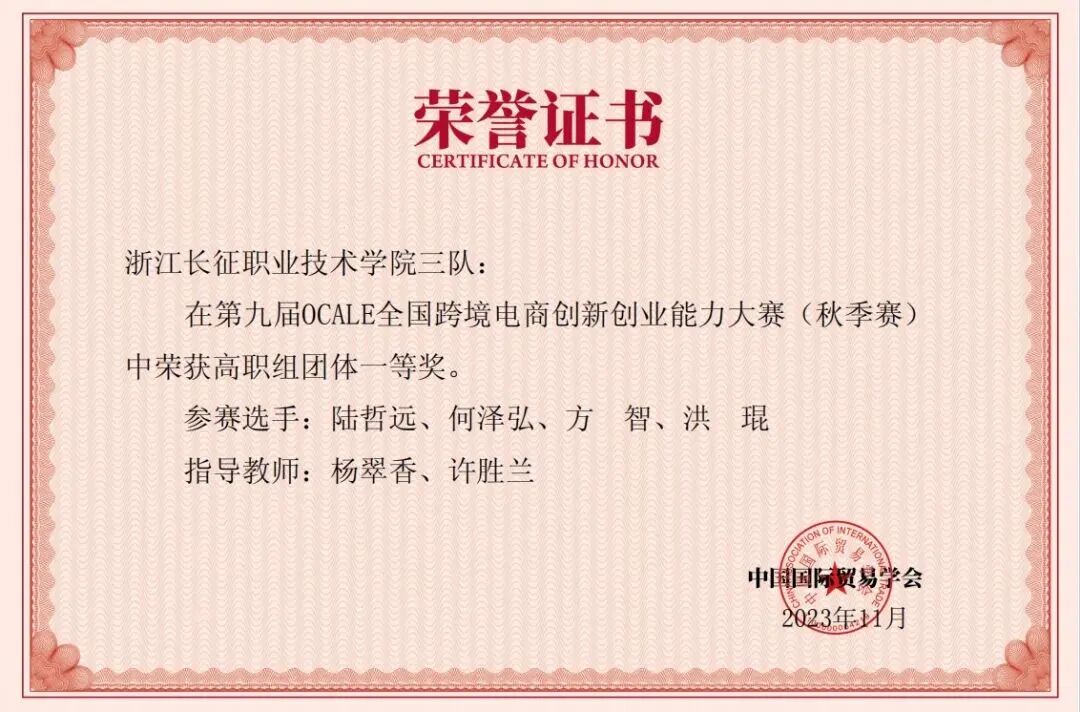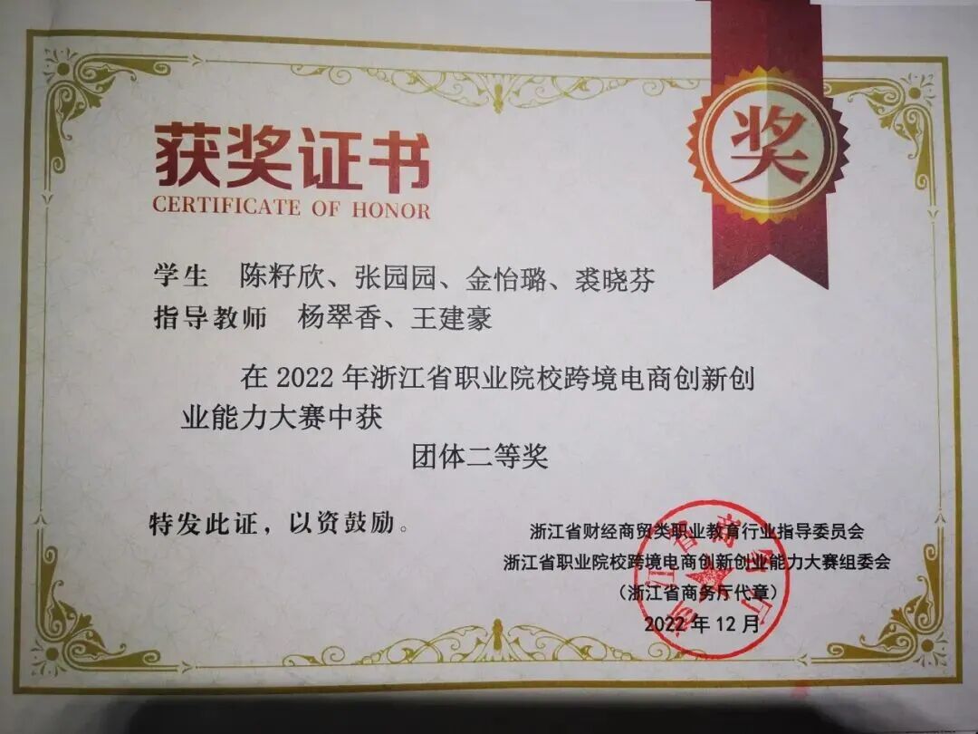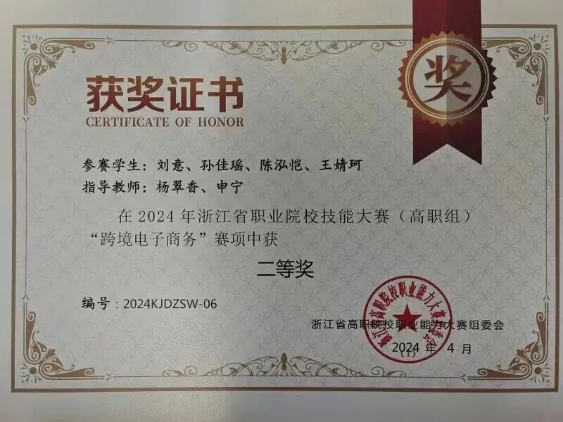 近三年,教师获得省教学能力比赛三等奖3项,学生在跨境电商相关赛事荣获省级二等奖、三等奖各3项,全国行业协会特等奖3项,一等奖15项等,形成“以赛促学、以赛验效”的良性循环。