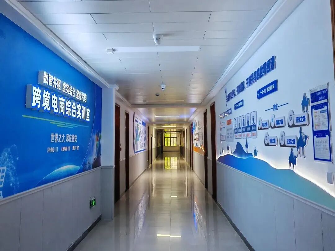 实训基地建有跨境电商综合实训室、电商直播实训室、数智商业体验馆、“一带一路”商品展销实训室、数字营销实训室、国际交流中心等29间实训室。