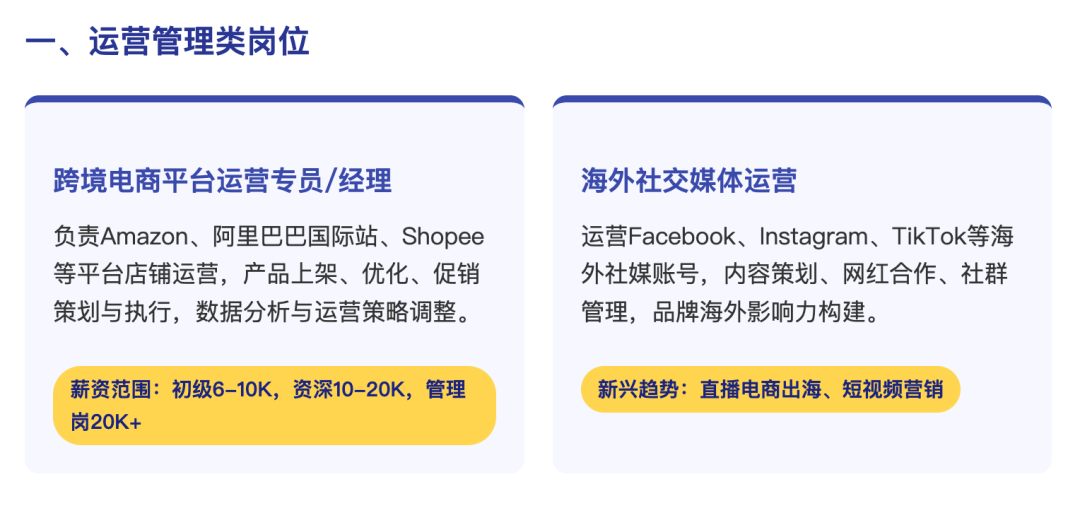 面向跨境电商企业、外贸企业及新兴跨境电商平台,从事TEMU(海外拼多多)、TikTok Shop(海外抖音)、亚马逊、eBay、速卖通、阿里巴巴国际站、Shopee(虾皮)、Lazada、SHEIN(希音)、Ozon、Coupang等跨境电商平台的运营、直播、营销推广、数据分析、视觉设计、海外客服、国际物流等工作,也可在跨境电商多平台进行自主创业。