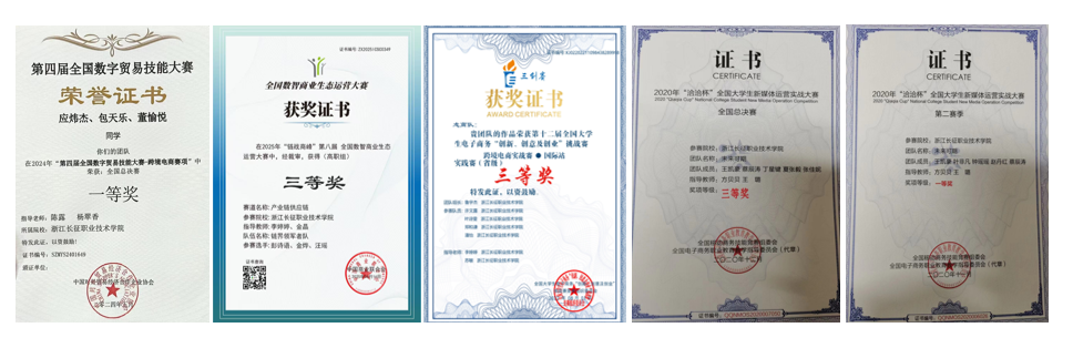 在全国大学生电子商务“创新、创意及创业”挑战赛、浙江省职业院校技能大赛等各类专业大赛中屡获殊荣。这些竞赛不仅强化了同学们的专业技能,也提高了就业及创业能力。部分同学在赛后,成功地将自己的项目从赛场带到了市场,实现了从创意到创业的进阶。