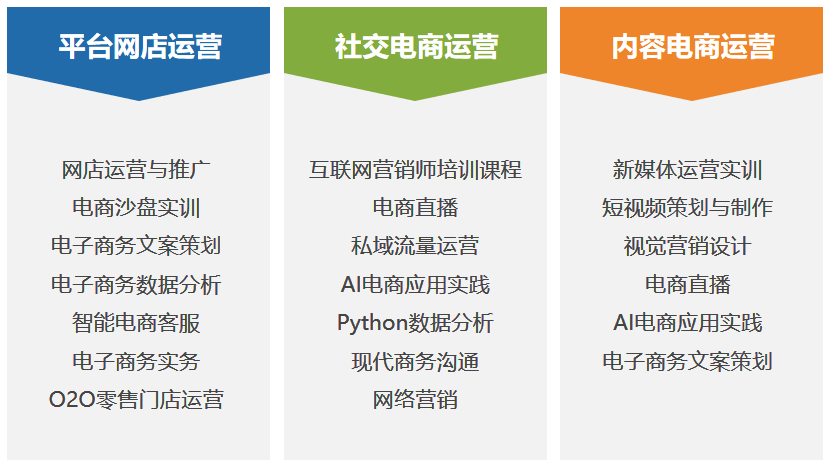 针对市场及企业实际需求,结合专业特点,我们的课程设置对应淘宝、京东等平台网店运营;社群、私域等社交电商运营;短视频、直播等内容电商运营三大职业发展方向。