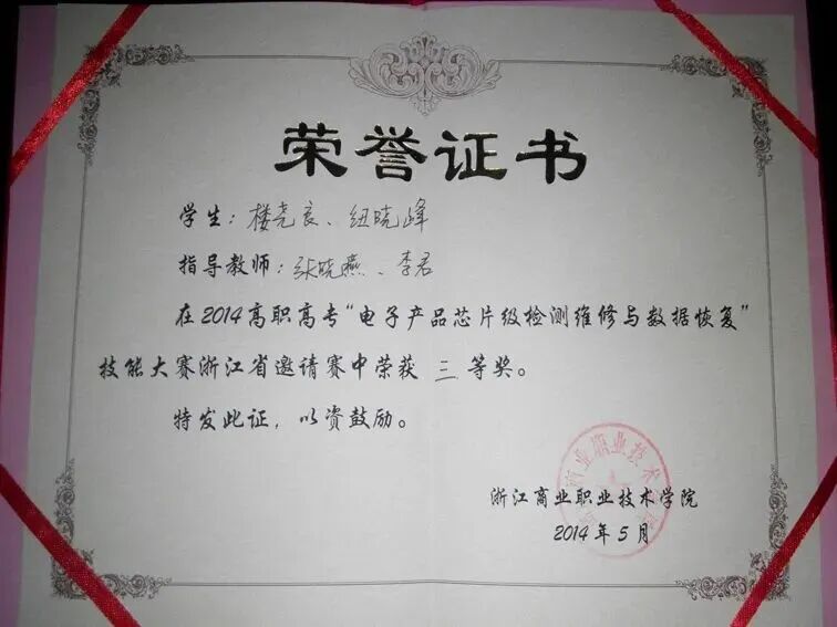 2014年浙江省高职高专院校技能大赛——电子产品维修大赛(芯片级) 三等奖(楼尧良 钮晓峰 指导教师 张晓燕 李君)