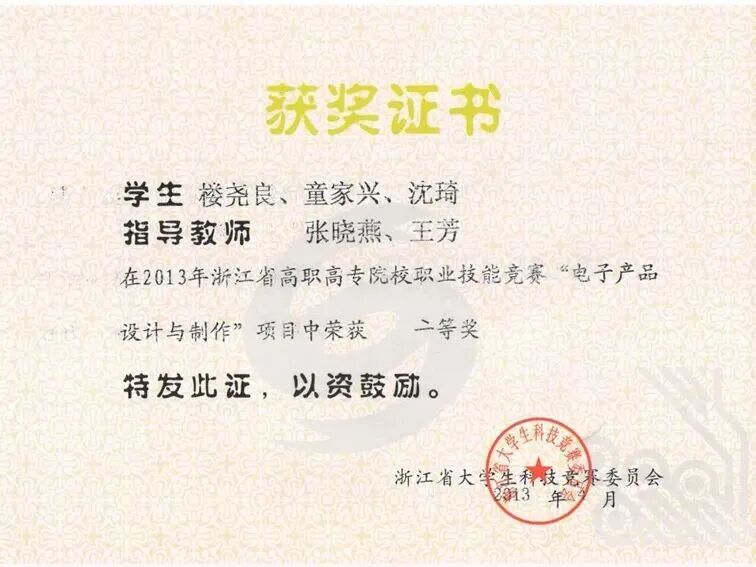 2013年浙江省高职高专院校技能大赛——电子产品设计及制作 二等奖(童家兴 楼尧良等 指导教师 张晓燕 )