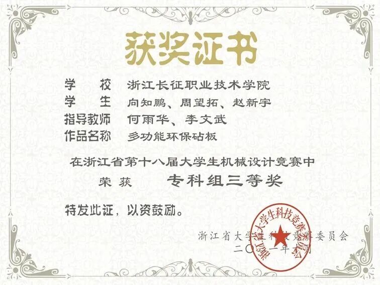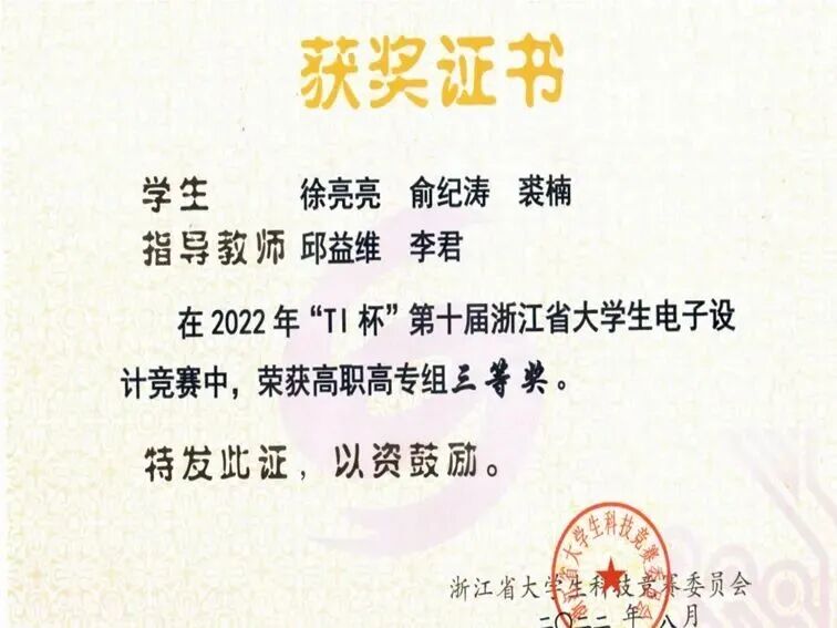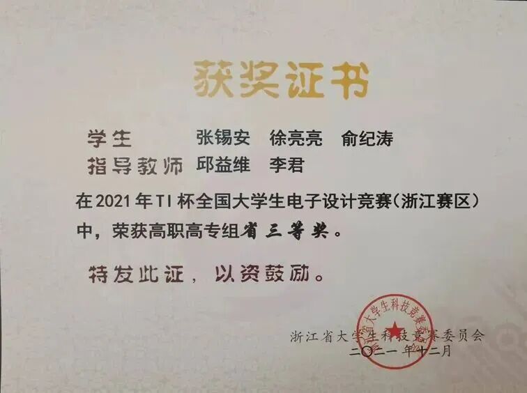 2022年参加第十届浙江省大学生电子设计大赛获得三等奖。