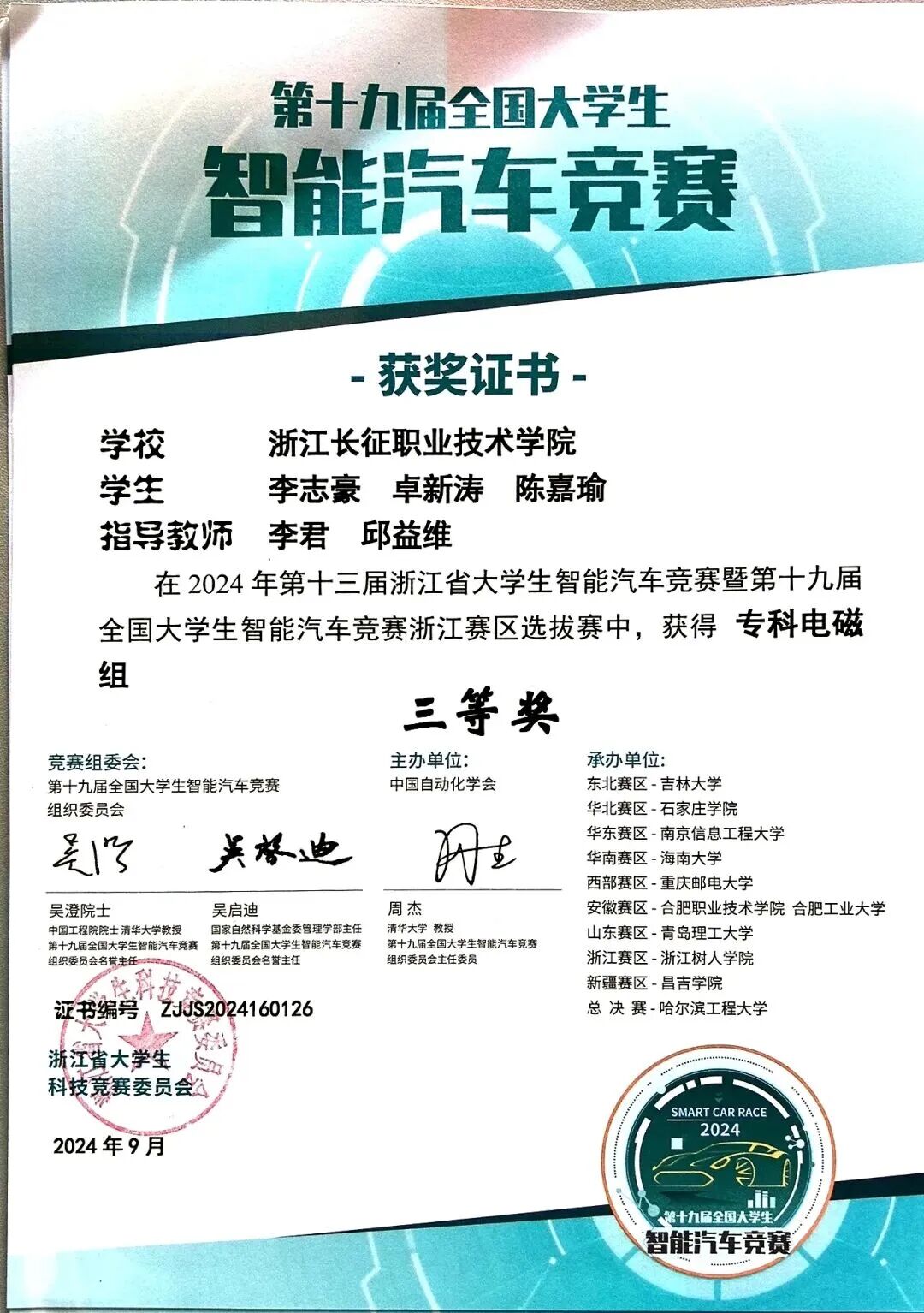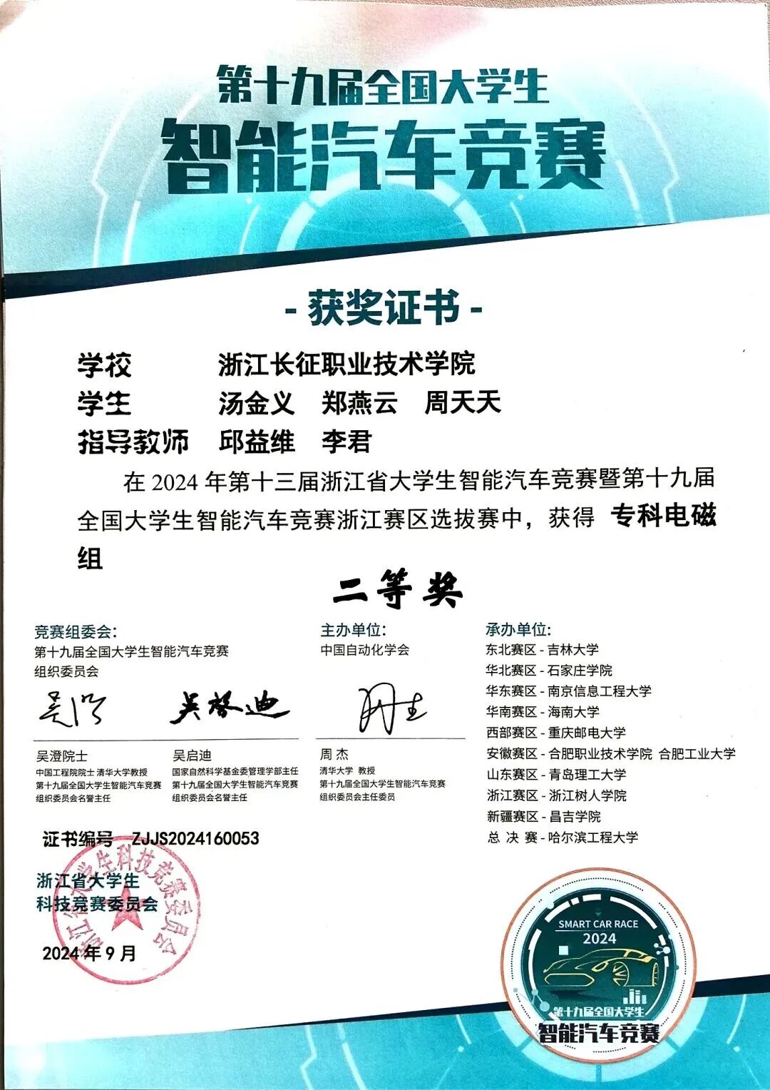 2024年参加第十三届浙江省大学生智能汽车竞赛暨第十九届全国大学生智能汽车竞赛浙江赛区获得“专科电磁组”二等奖及三等奖。