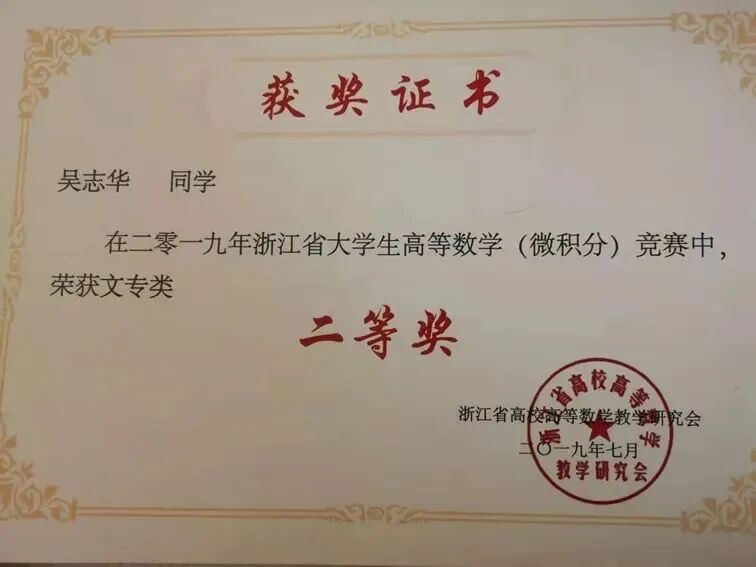 2019年浙江省大学生高数竞赛 二等奖(吴志华 )